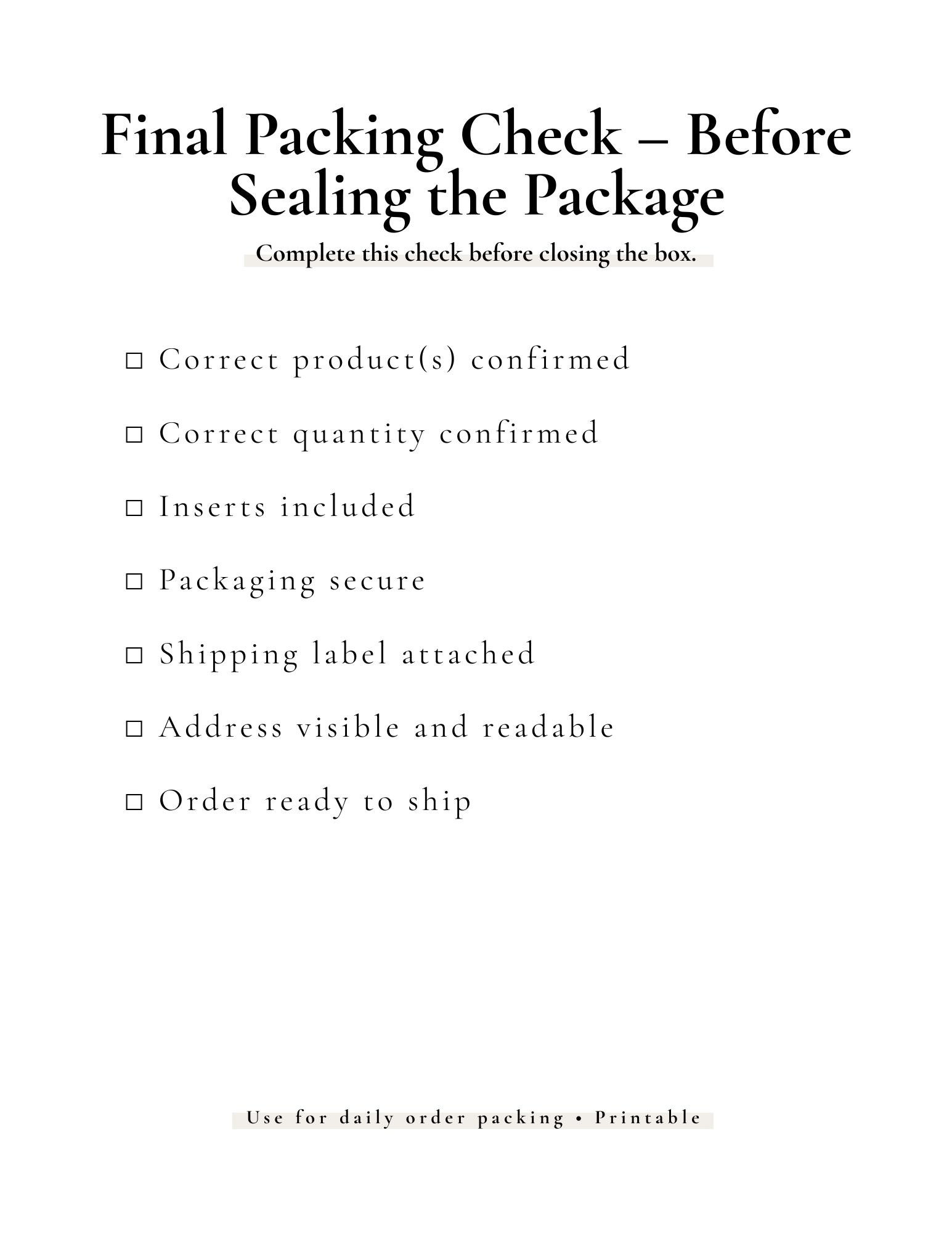 This Complete Packing & Shipping Insert System is a simple, print-only toolkit designed to help small businesses streamline their order packing process, stay consistent, and ensure every package is ready to ship with confidence.